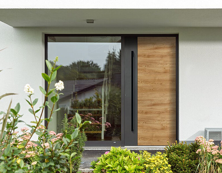 Die Verschmelzung von PUR Design und PUR Natur ist da! Das Modell Denara vereint erstmalig gepulverte und folierte Flächen auf einer Füllung. In den beiden Beispielen hebt das klassische Anthrazit den warmen Amber-Holzton hervor und integriert ihn harmonisch in die Fassade. Es warten jedoch noch viele weitere Gestaltungsmöglichkeiten: RAL-Töne lassen sich neben den beliebten Holztönen selbstverständlich auch mit den Designoberflächen in Betonoptik oder Corten kombinieren. Dabei kann die Fläche mit dem Griff oder das restliche Türblatt foliert werden.