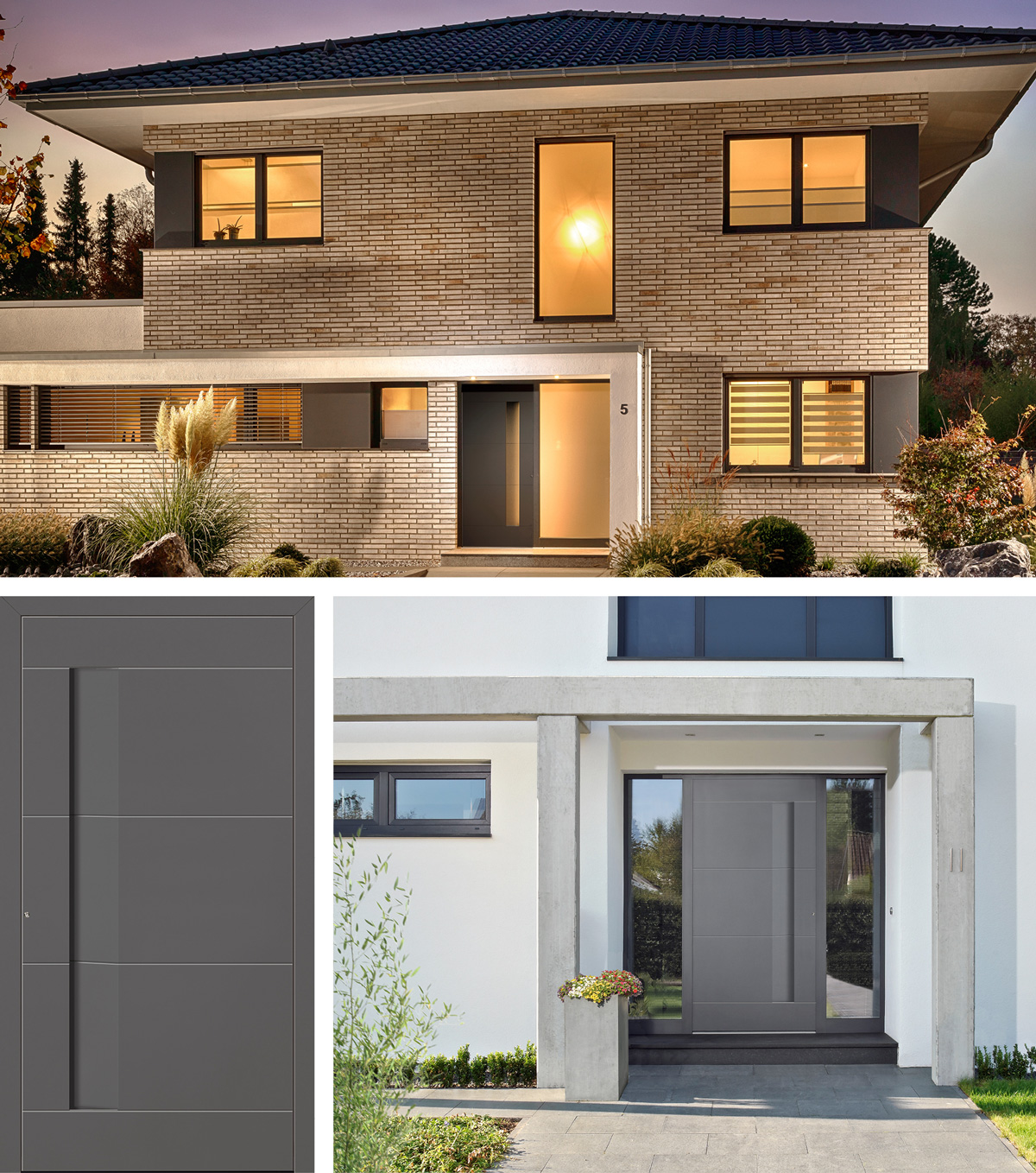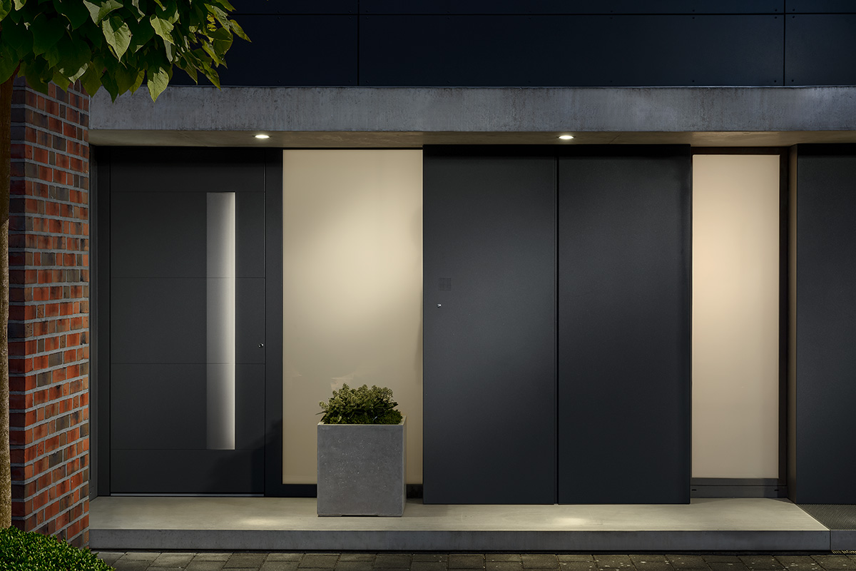 Huisdeurgreep, model en kleurstelling bepalen hier de optische effecten van het huisdeurpaneel. Deze oplossing is ook geschikt voor meerdelige portalen en extra hoogtes. Het oog van de toeschouwer wordt door niets afgeleid en concentreert zich alleen op de huisdeurvleugel met greep. Het is functioneel en ergonomisch gevormd. Beglaasde zijdelen laten licht en helderheid binnen in de gang. Ook de veiligheid komt niets te kort Gesloten opdekpanelen aan beide zijden zorgen voor maximale beveiliging tegen inbraak dankzij een externe 3 mm dikke en interne 2 mm dikke aluminium deklaag.